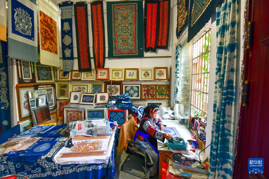 在贵州省安顺市黄果树旅游区黄果树镇石头寨村,村民赶制游客的蜡染订单(11月13日摄)。新华社记者 杨文斌 摄