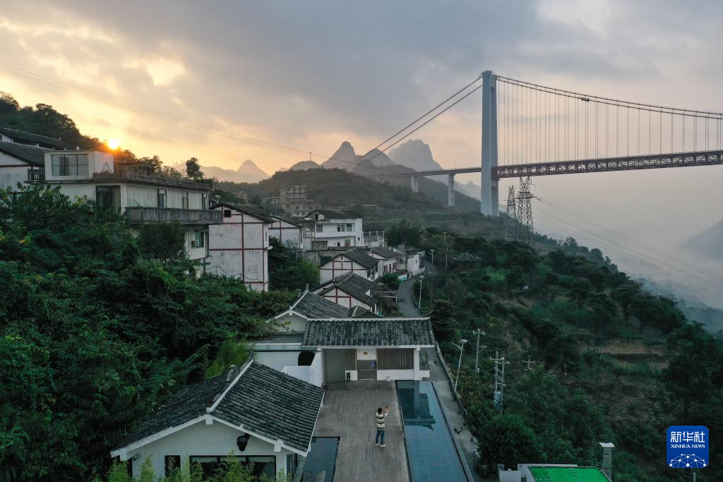 11月14日,游客在贵州省安顺市黄果树旅游区白水镇乌拉村的一家民宿楼顶拍摄坝陵河大桥景观(无人机照片)。新华社记者 杨文斌 摄