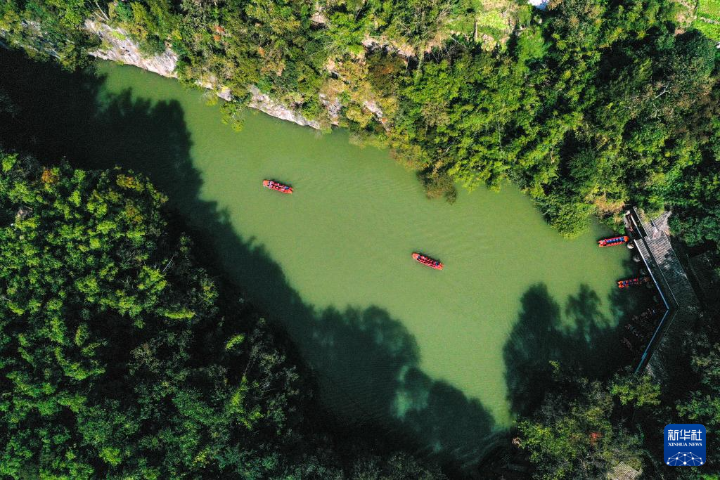 11月14日,游客在贵州省安顺市黄果树旅游区龙宫景区乘船观光(无人机照片)。新华社记者 杨文斌 摄