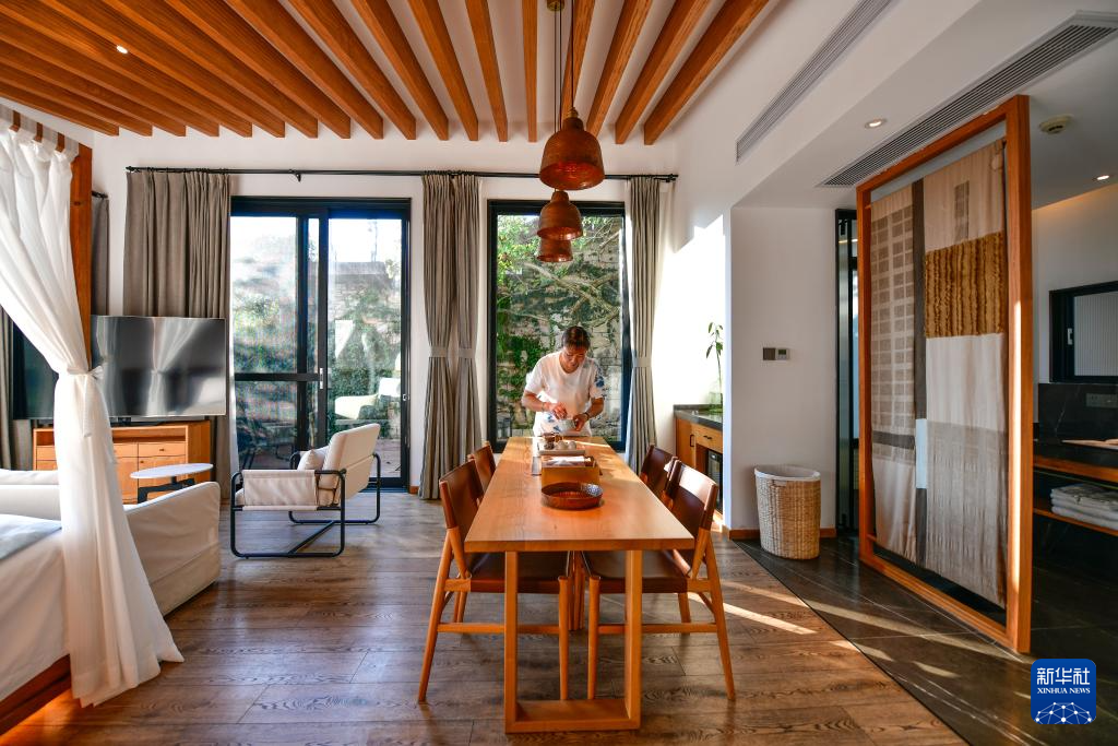 在贵州省安顺市黄果树旅游区黄果树镇石头寨村,村民在一家民宿整理客房(11月13日摄)。新华社记者 杨文斌 摄