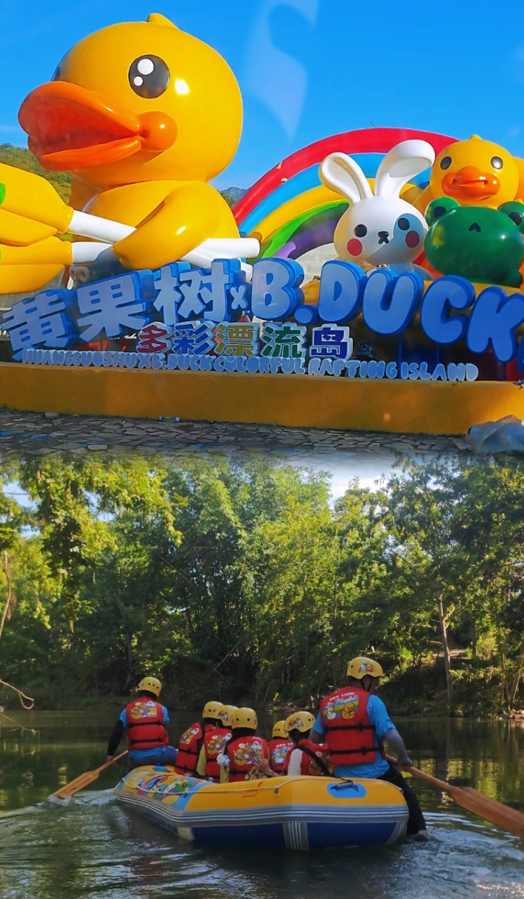 黄果树小黄鸭主题漂流项目位于安顺市黄果树景区天星桥至郎宫半岛黄金路线,漂流线路全长约4.2公里,途中设有12处险滩,漂流时长约1至1.5小时。