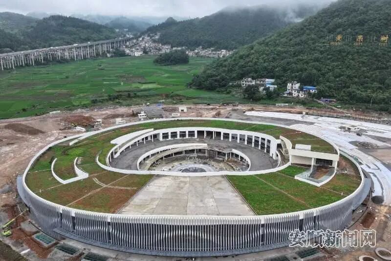 走进黄果树游客服务中心项目现场,圆弧形建筑宛如天然喀斯特溶洞般浑然天成,玻璃幕墙勾勒出少数民族银饰的灵动光泽,楼顶草坪的青葱绿意更添几分生机。这座融自然肌理与文化底蕴于一体的建筑,已于6月30日主体正式完工,为黄果树建设世界级旅游景区再添一枚重要砝码。