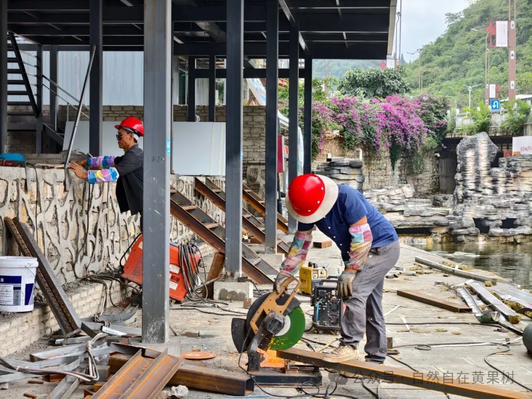 在黄果树旅游区荡上,城市外滩项目工地呈现出一派繁忙而有序的工作景象。工人们分工明确,紧密协作,有的工人正细致地铺设着地砖,另一侧,电焊机火花四溅,电焊工人专注于每一个焊接点的精准与牢固。项目负责人唐刚介绍道:“这个项目我们预计是6月20号基本上就全部完工了,现在我们在开始招商了,暂时有我们安顺的一些名小吃的商家入驻,我们打造这个地方就希望能把更多游客留下来。”