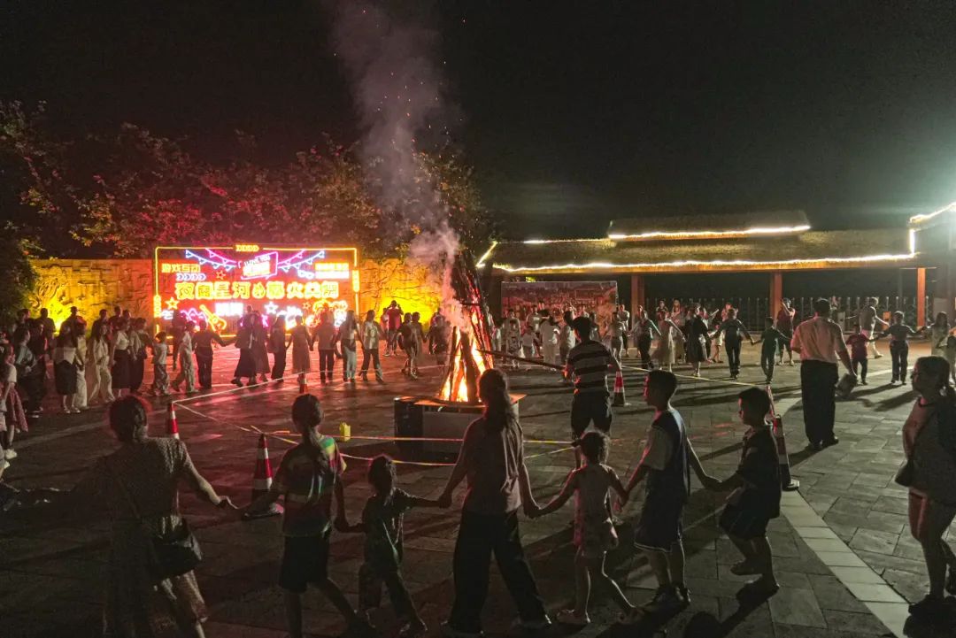 现场,熊熊篝火在广场内跃动升腾,成为现场热情汇聚的焦点。游客们环绕篝火,在领舞带领下,共同跳起独具魅力的贵州民族舞蹈。期间,各种趣味互动小游戏、游客即兴才艺展示及点歌环节,巧妙穿插其中,确保每位游客朋友深度参与这场视听与文化盛宴,沉浸体验特色民族风情。从暖场民族歌舞、景区文化介绍、篝火点火仪式到最后向现场朋友们传递的美好祝福,现场氛围热烈,高潮迭起。