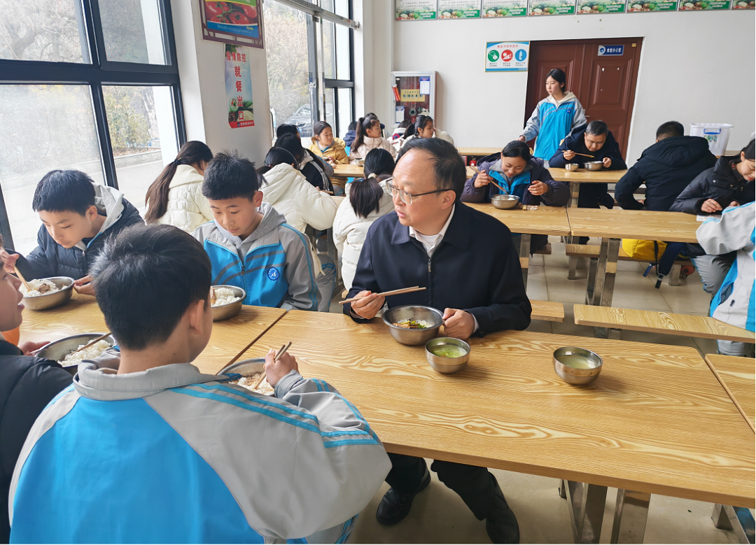 董立军在黄果树民族中学食堂与学生一同就餐,并与学生亲切交谈,询问饭菜口味、分量,耐心倾听同学们对食堂菜品、服务的意见和建议。他强调,营养膳食对学生成长发育至关重要,关系到孩子的未来,更关系到社会和谐稳定,要严格落实食品安全管理制度,规范操作程序,强化食材溯源监管,科学合理搭配餐食,让学生吃得营养、吃得健康、吃得安全。