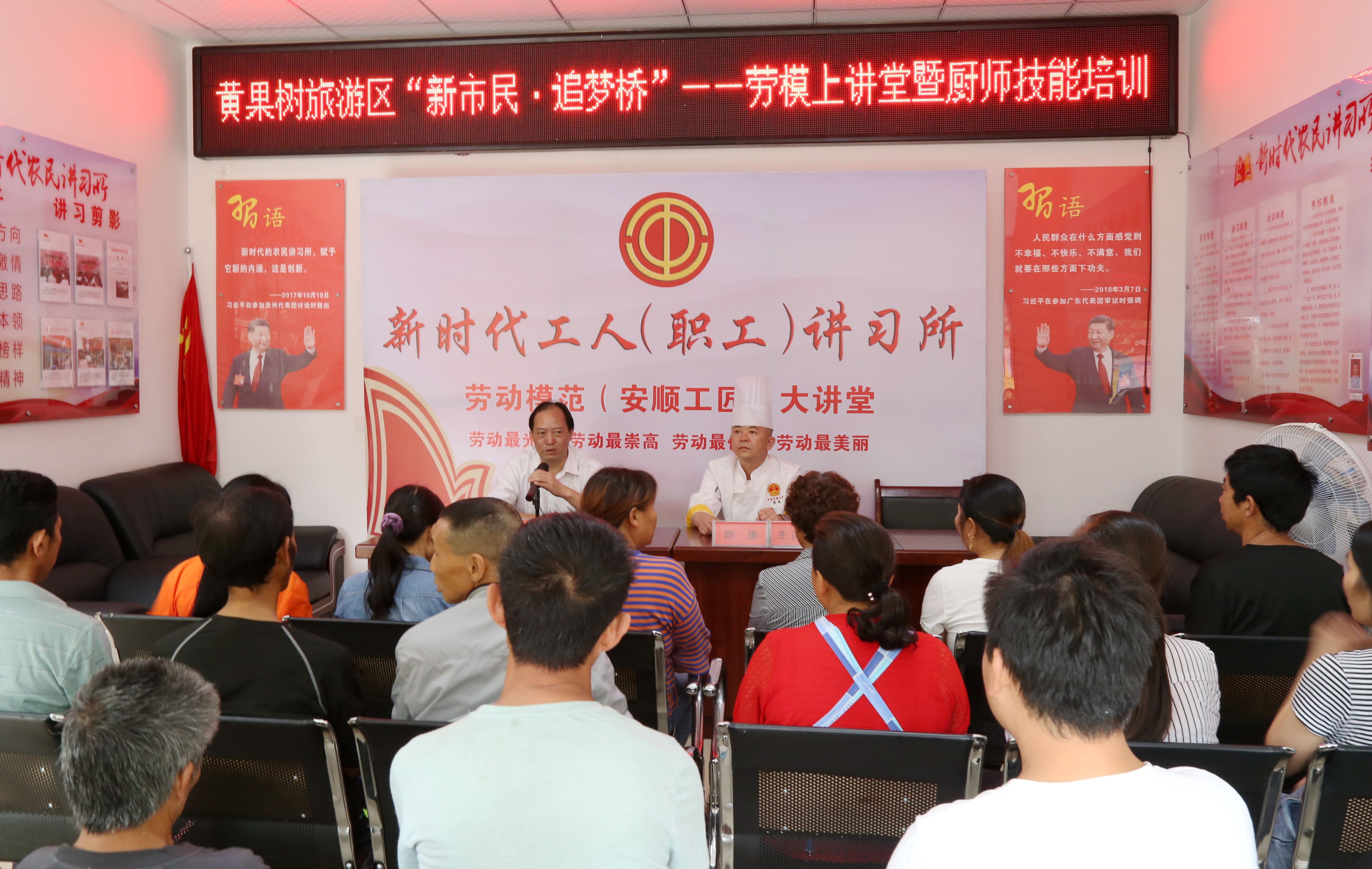 6月12日,黄果树旅游区工青妇到黄果树旅游区易地扶贫搬迁安置点——幸福小区组织开展“新市民·追梦桥——劳模上讲堂暨厨师技能培训。黄果树旅游区总工会副主席周义伟出席活动并讲话,幸福小区群众30余人参加讲习和培训。