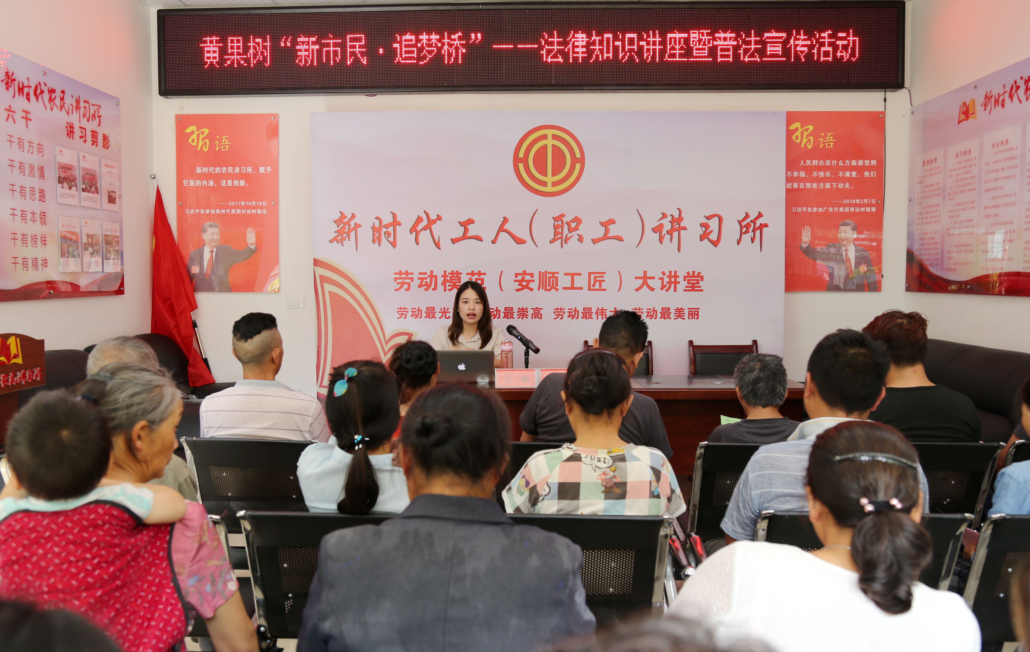 2020年6月15日,黄果树旅游区工青妇邀请贵州联通(关岭)律师事务所律师组成志愿服务队,到黄果树旅游区易地扶贫搬迁安置点幸福小区组织开展“新市民·追梦桥——法律知识讲座暨普法宣传活动。黄果树旅游区总工会副主席周义伟出席活动并讲话,幸福小区群众30余人参加活动。