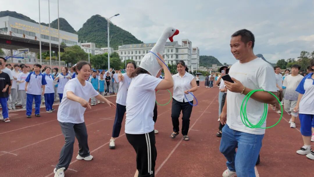 随后,丰富多彩的趣味活动将现场气氛推向高潮。力量与技巧并存的“拔河比赛”吸引了众多师生围观,呐喊声、欢呼声此起彼伏;妙趣横生的“套大鹅”游戏考验了大家的眼力和手感,欢笑声不断;“袋鼠跳”和“夹气球”环节,老师们一改平日的严肃,灵活可爱的身影引得全场阵阵喝彩;最受欢迎的“抢零食”活动更是激情四射,老师们为了给各班同学“抢”更多的零食,使尽浑身解数,校园变成了欢乐的海洋。