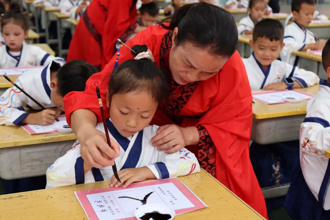 “人字一撇一捺,寓意着相互支撑、堂堂正正。”在老师们的带领下,一年级新生握起毛笔,在宣纸上写下人生的第一个“人”字。